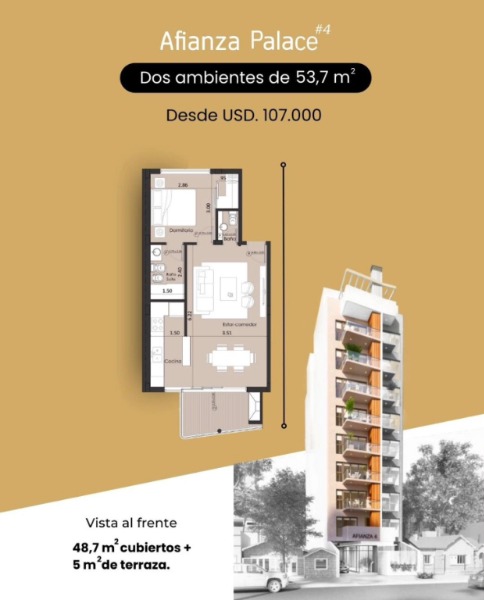 8vo piso al frente de 54 m2 en u$s 107.000