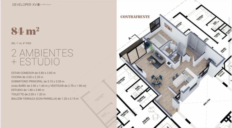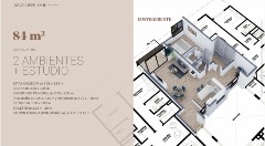 Te presentamos este departamento de 2 ambientes + Estudio (es un ambiente muy amplio por lo que se considera un 3 ambientes el departamento) este departamento tiene 84m2 totales que se destaca por la excelente calidad de construcción y diseño moderno, con la música como eje central del diseño.
